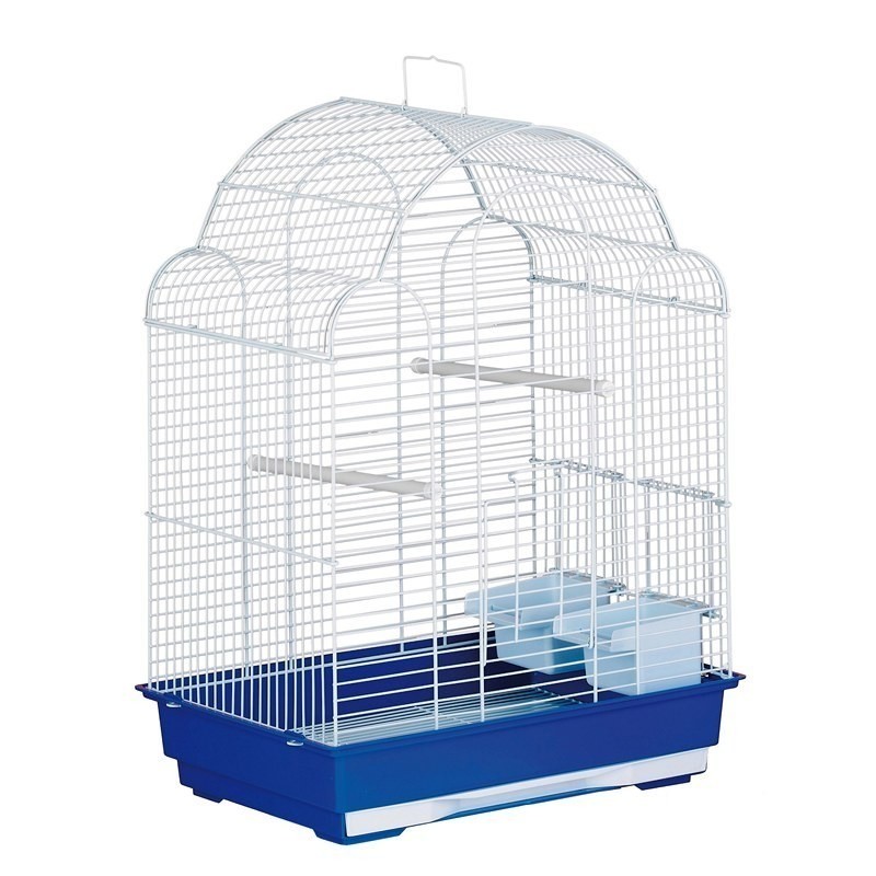Jaula para pájaros con base azul.